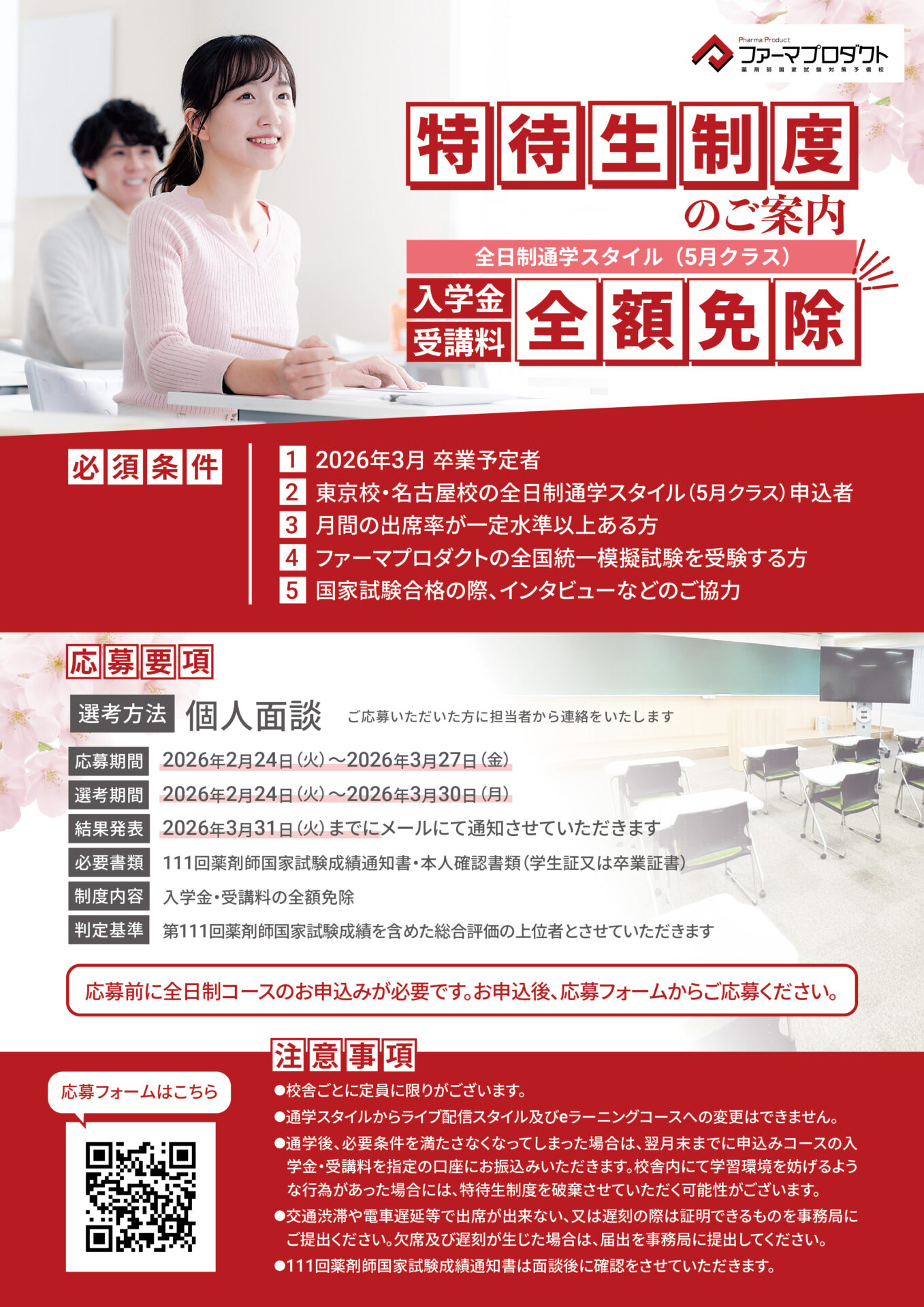 【合否判定】 第111回薬剤師国家試験成績を含めた総合評価の上位者とさせていただきます。